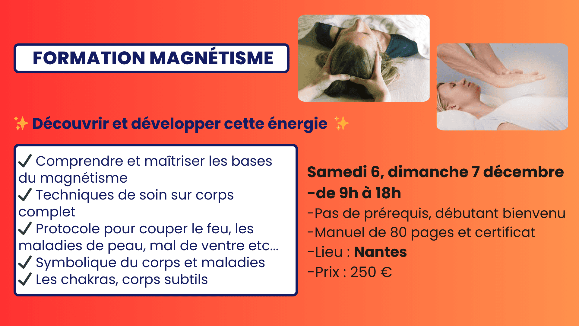 - On voit les bases du magnétisme qui vous permettront de travailler sur l’ensemble des problématiques rencontrées dans votre pratique ( émotionnel, maux physiques, et couper le feu bien sûr )