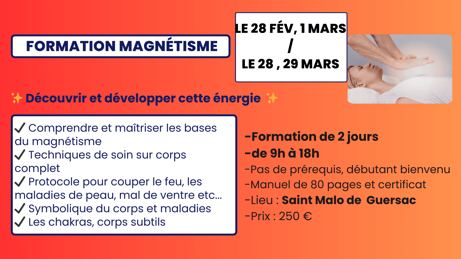 - Pendant ces 2 jours vous apprendrez à faire un soin sur tout le corps (le magnétisme énergétique) et aussi sur des maux physiques localisés sur une partie du corps (le magnétisme curatif), ainsi le soin à distance