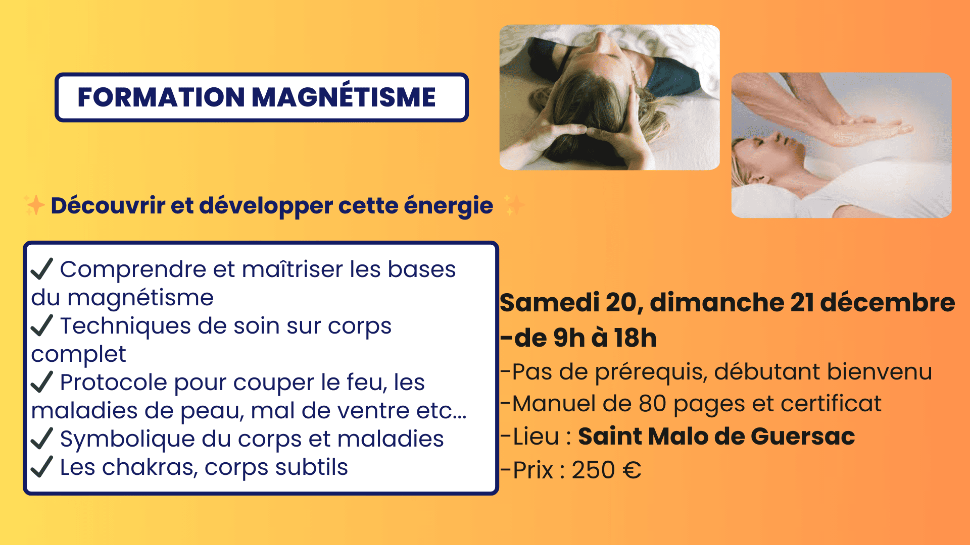 • Pendant ces 2 jours vous apprendrez à faire un soin sur tout le corps (le magnétisme énergétique) et aussi sur des maux physiques localisés sur une partie du corps (le magnétisme curatif), ainsi le soin à distance